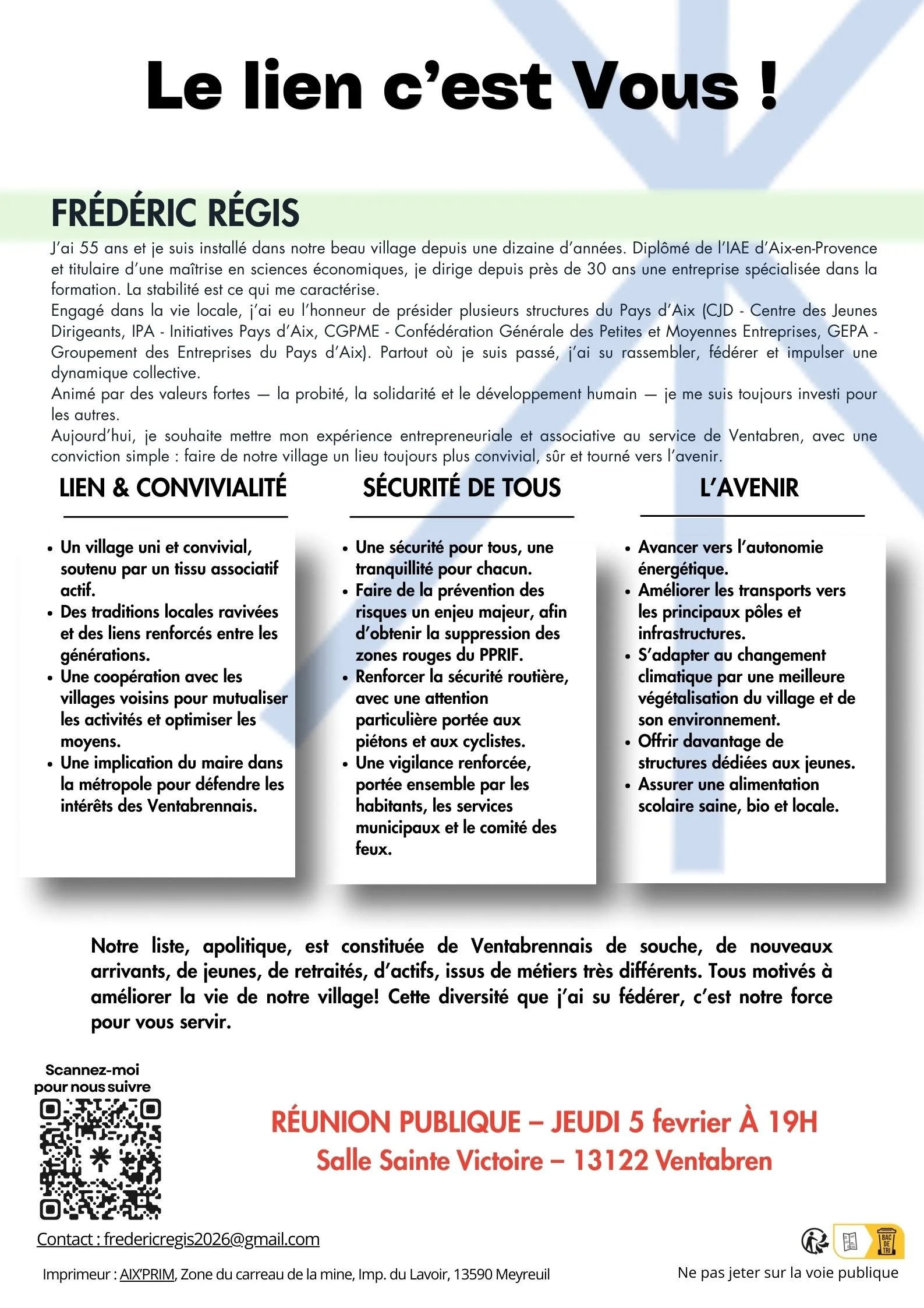 Notre liste est constituée de Ventabrennais de souche, de nouveaux arrivants, de jeunes, de retraités, d’actifs, issus de métiers très différents. Tous motivés à améliorer la vie de notre village. Cette diversité que j’ai su fédérer, c’est notre force pour vous servir.