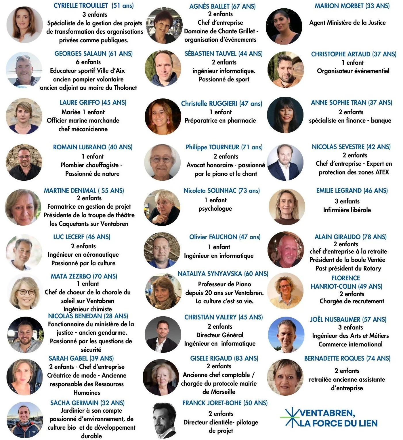 Notre liste est à l’image de notre commune : diversifiée, ouverte et riche de parcours variés. On y retrouve des habitants de longue date, des nouveaux arrivants, des artisans, des entrepreneurs, des employés, des acteurs de la vie associative, des retraités… Autant de compétences et d’expériences qui seront précieuses pour assurer une gestion rigoureuse, humaine et équilibrée de la commune.